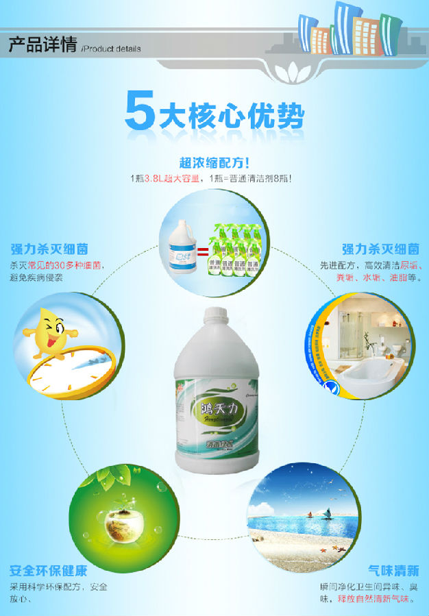 清潔、消毒、殺菌三合一全能消毒劑于酒店、超市、學(xué)校、醫(yī)院、等公共場(chǎng)所的衛(wèi)生保潔、用于地毯發(fā)霉時(shí)、加到清洗地毯水中。